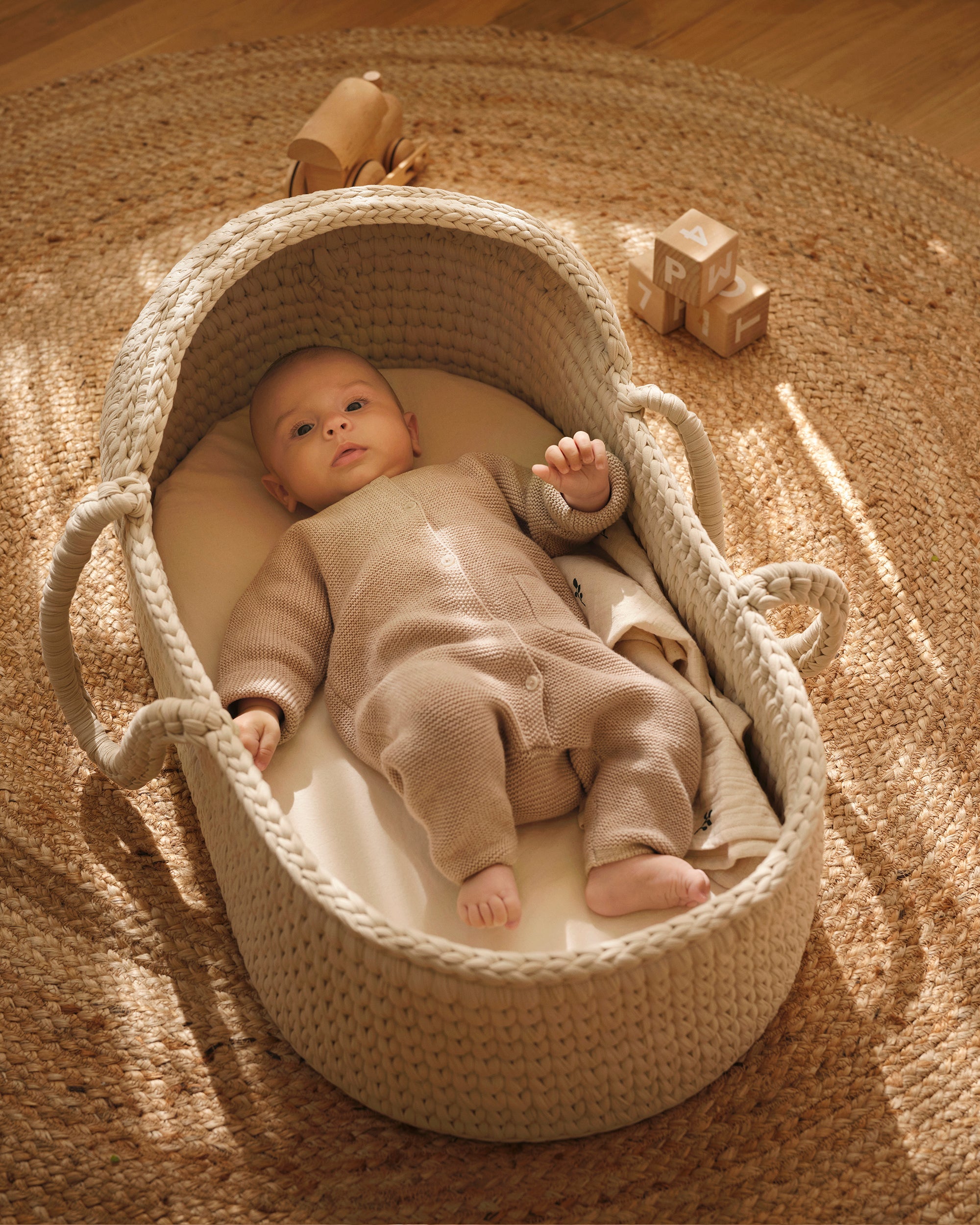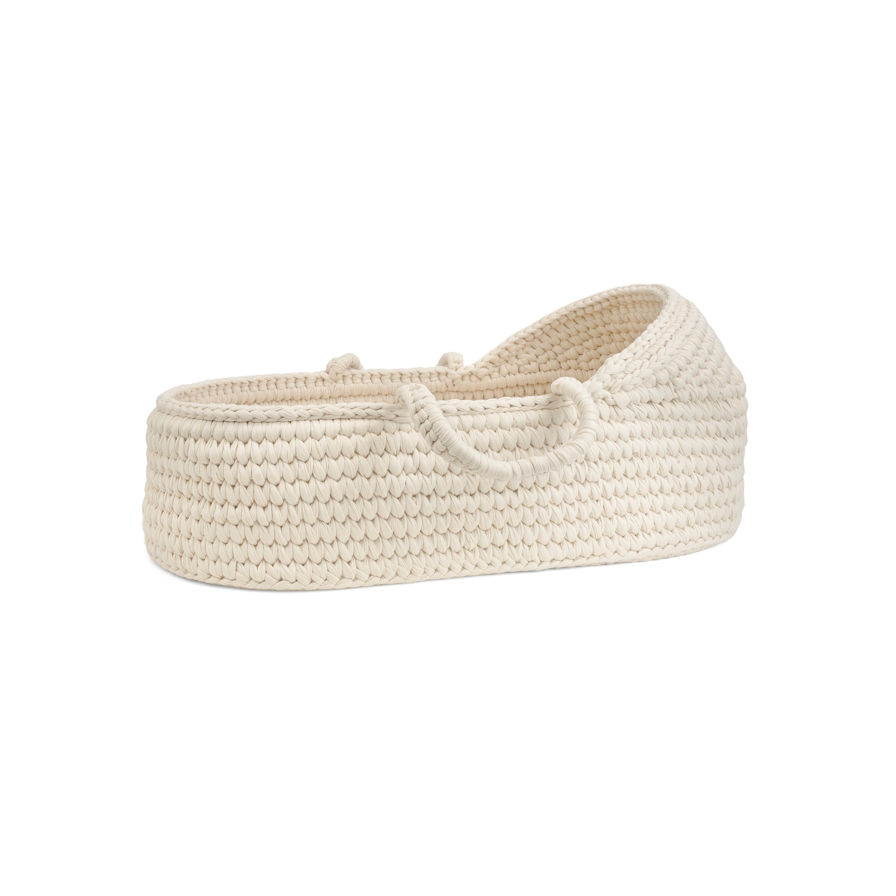 Med sin inspiration från skandinavisk design kombinerar denna bärsäng funktionalitet med tidlös estetik. De stabila handtagen gör den enkel att bära runt i hemmet, ta med när ni är på språng eller placera den bredvid sängen, så att din lilla alltid har en välbekant och trygg plats att vila på. Eftersom den är helt handvävd i luftigt virkat material främjar den god ventilation, vilket hjälper ditt barn att kunna hålla en behaglig temperatur.